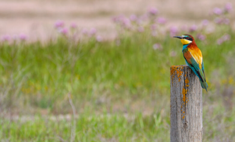 Esta imagen del abejaruco europeo es un ejemplo inspirador de cómo la fotografía de naturaleza no se trata solo de documentar, sino de transmitir belleza, equilibrio y conexión. Cada elemento en la escena –desde el colorido plumaje hasta la textura del poste y el suave fondo floral– colabora en una composición que emociona y enseña.