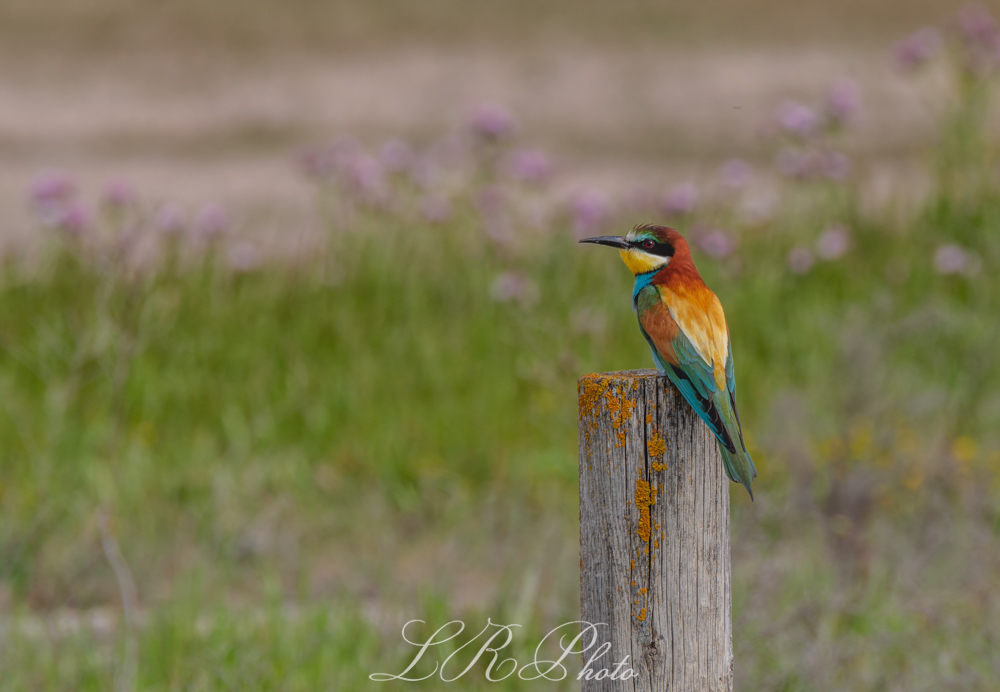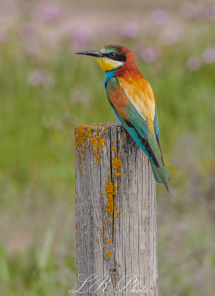 En la fotografía de naturaleza, hay momentos en los que la luz, el sujeto y el entorno se alinean para crear una escena que no solo es visualmente impactante, sino que también transmite una profunda sensación de serenidad. Esta imagen del abejaruco europeo (Merops apiaster), tomada con un fondo suavemente desenfocado de verdes y violetas silvestres, es un ejemplo perfecto de ello.